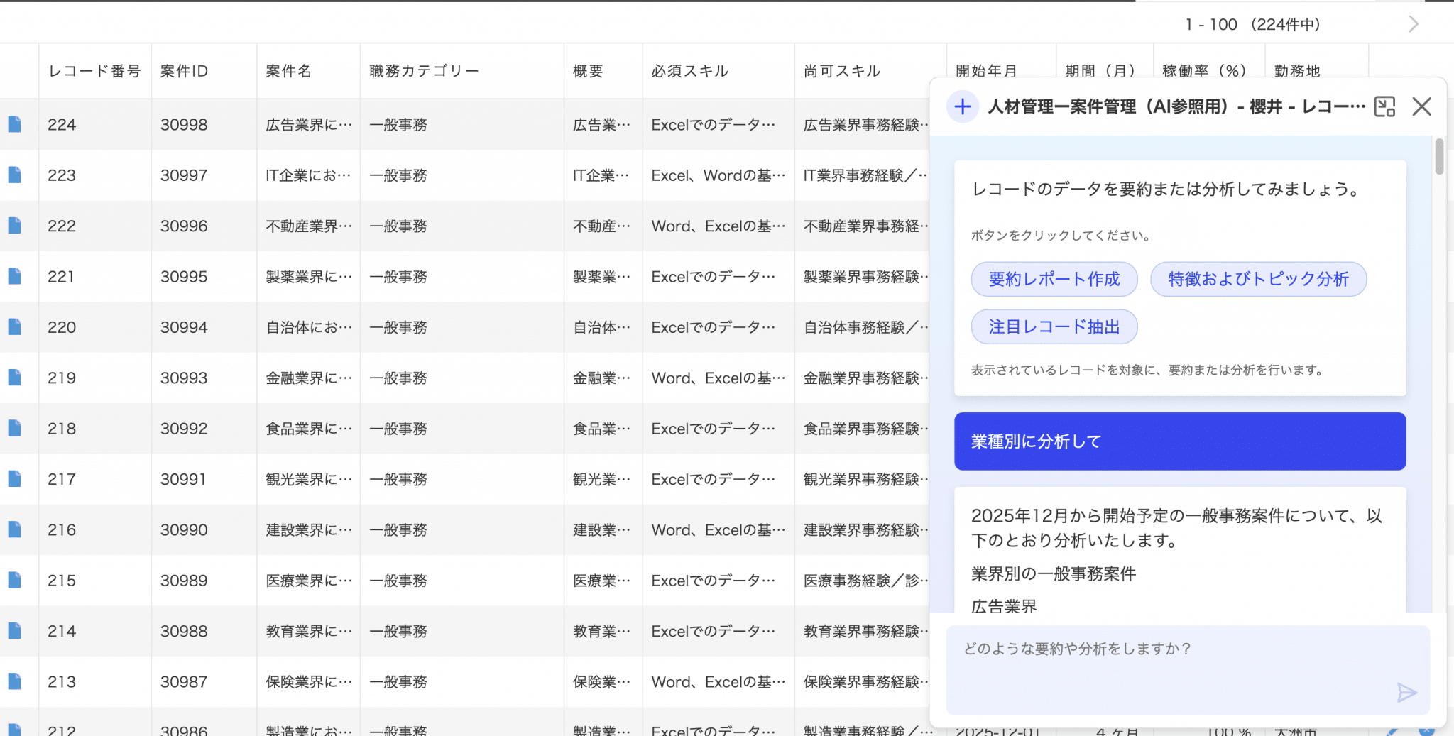 手軽にレコードの情報を元に分析をしたい場合はレコード一覧分析AIを利用するのが良いです。