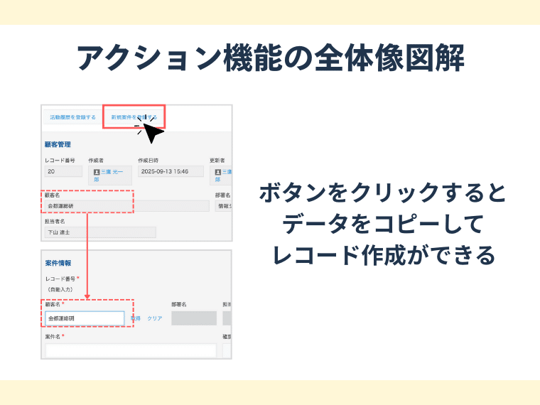 一方、アクション機能はコピー元のレコードを基に新規レコードを生成する仕組みです。