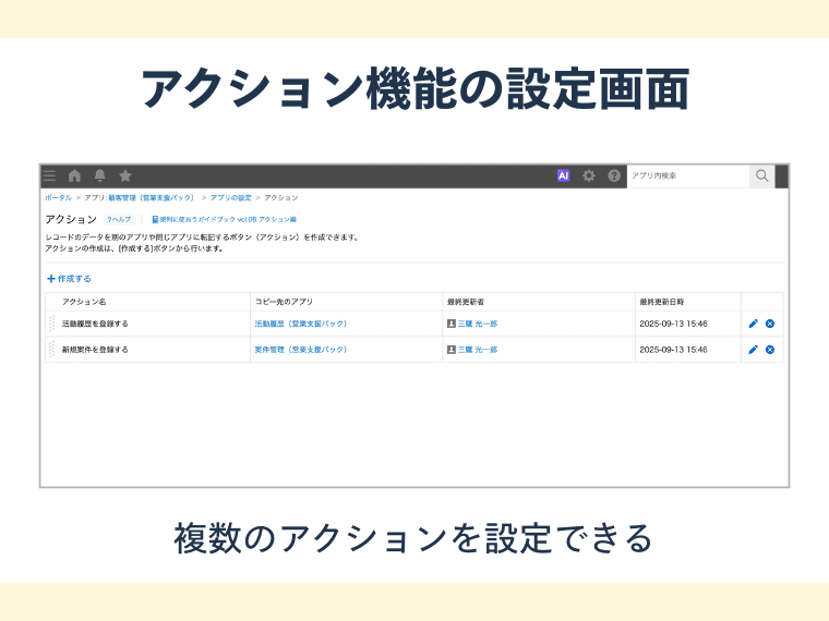 アプリの用途やレコードの構造に応じて、この設定画面を起点に複数のアクションを作成・管理していきます。