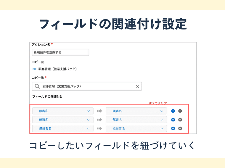 コピー元とコピー先で項目名が異なる場合でもフィールドの型が対応していれば紐付けは可能です。例えば「取引先名」→「顧客名」といったケースでは、どの項目が対応しているかを事前に確認しておき、手動でマッピングを設定します。