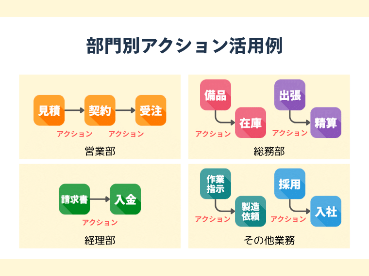 kintoneアクションは、部門や業務内容に応じてさまざまな形で活用できます。ここでは、営業・総務・経理といった主要部門、そして特殊業務における実践例を紹介し、自社での活用アイデアにつなげられるよう解説します。