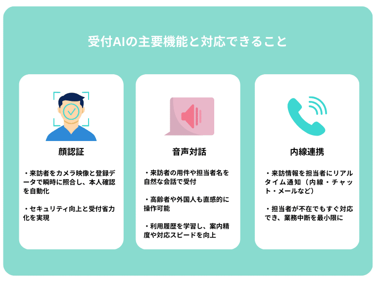 本セクションでは、受付AIが一般的に搭載する代表的な3つの機能を詳しく紹介します。