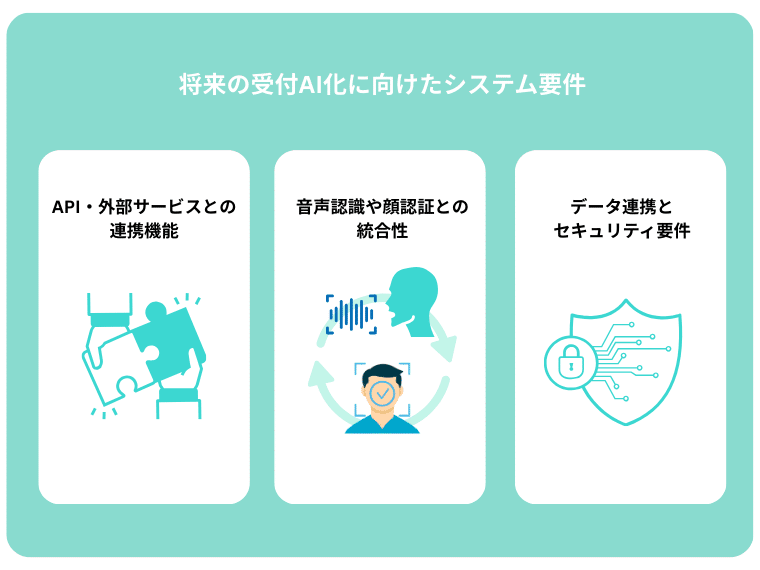 受付のAI化を行うためには、既存の受付システムが単に業務を自動化するだけでは不十分で、外部のAI技術とスムーズに連携できる設計が求められます。