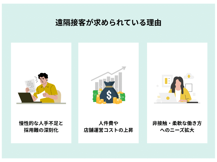 その背景には、日本社会が直面する複合的な課題とそれに対応するための合理的な手段としての遠隔接客の有効性があります。
