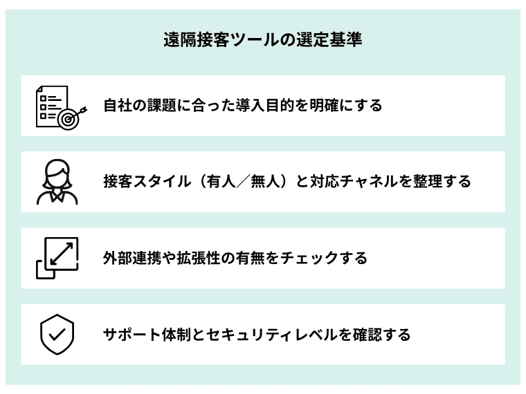 遠隔接客ツールは多種多様であるため、単に「使いやすい」「導入しやすい」という理由だけで選んでしまうと、後々の運用で課題が生じやすくなります。