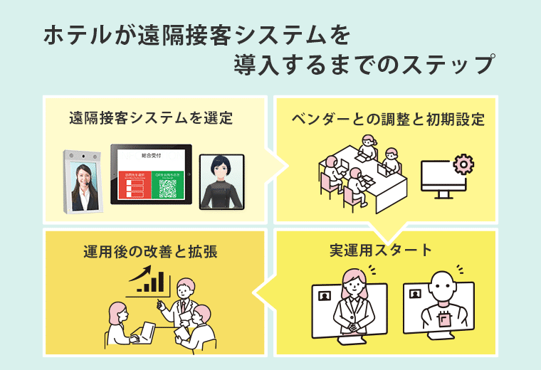 遠隔接客システムを効果的に導入するには単に製品を選ぶだけではなく、事前の準備や社内調整、運用設計までを段階的に進めることが重要です。ここではホテルが実際に導入を検討・実施する際の4つの主要ステップを紹介します。