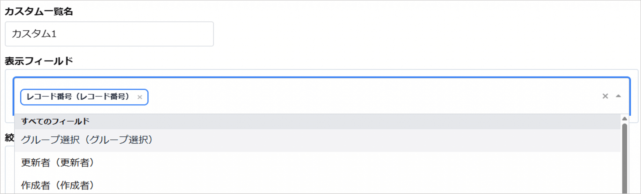 - ユーザー選択、グループ選択、組織選択、作成者、更新者は絞り込み条件に新規で追加できません。