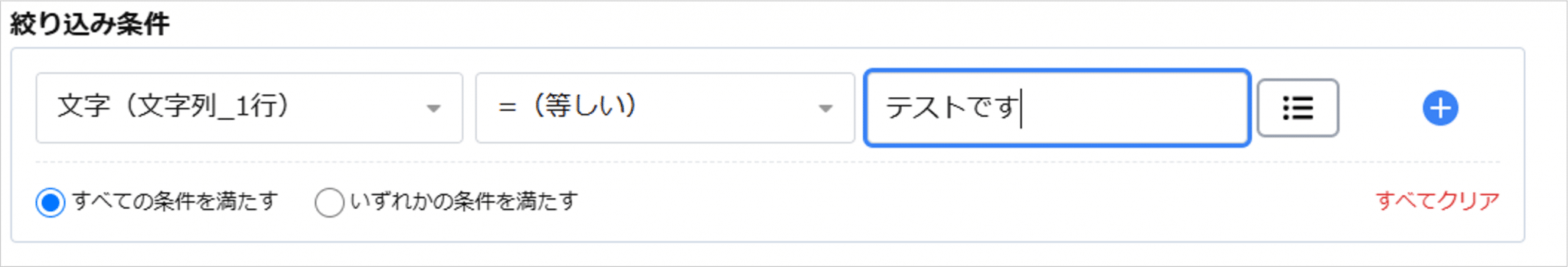 条件値を固定値で設定する場合、対象のフィールドと条件を選択し、右側の入力欄に設定したい値を入力してください。