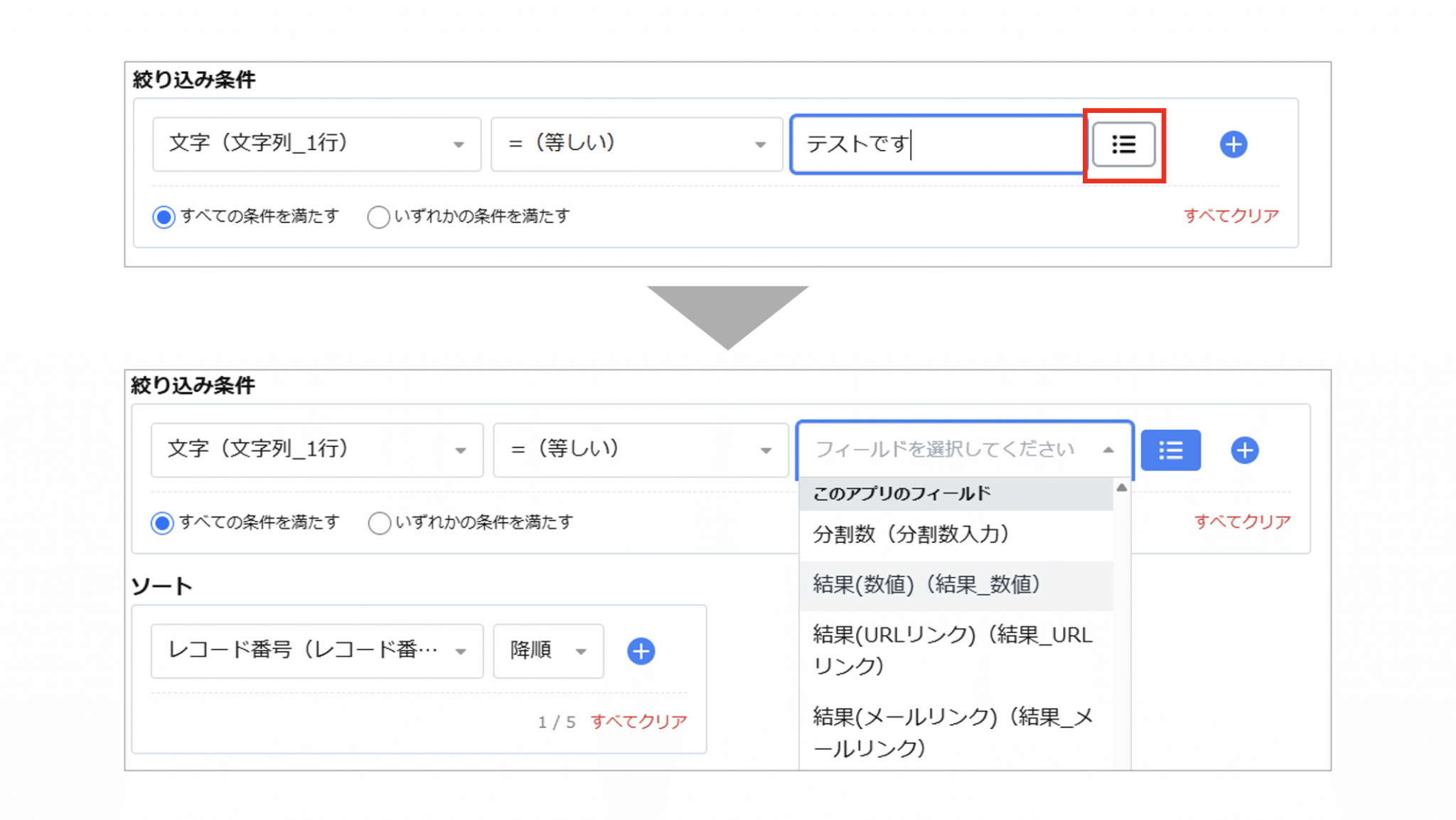条件値に設定元アプリのフィールドを指定する場合は、右側のアイコンをクリックし、入力欄を切り替えてください。