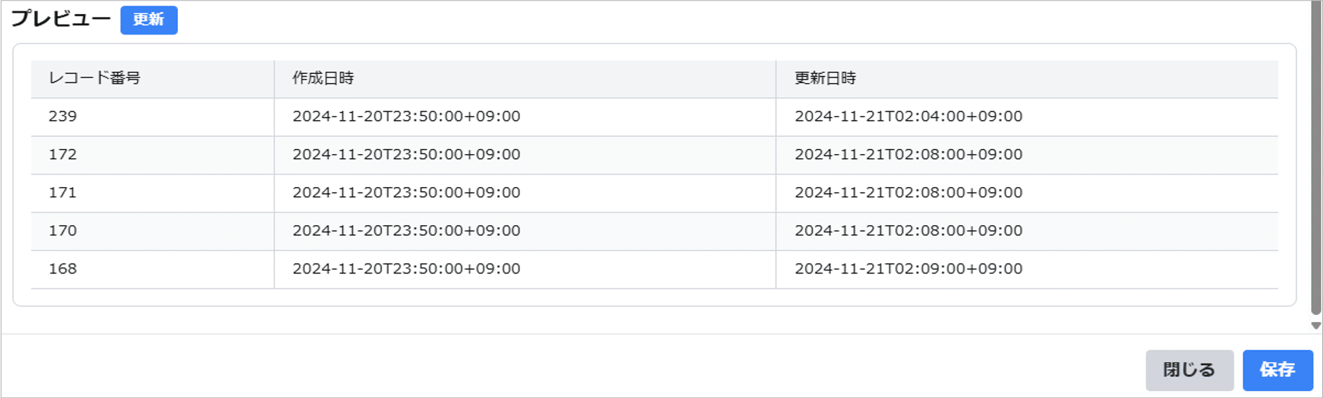 保存後にプレビュー欄の「更新」を押下すると、設定内容でレコード一覧から取得されるレコード情報を確認できます。