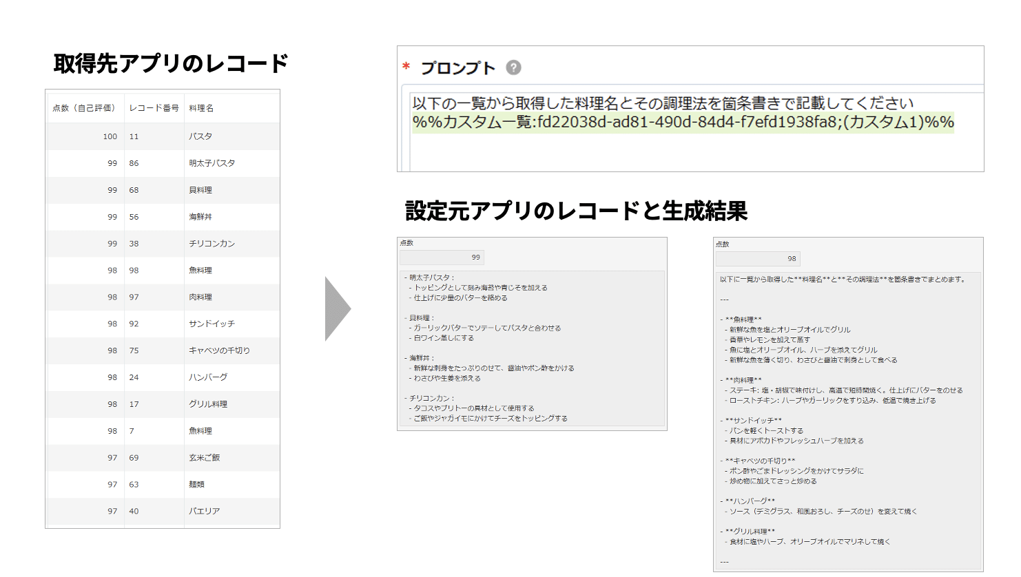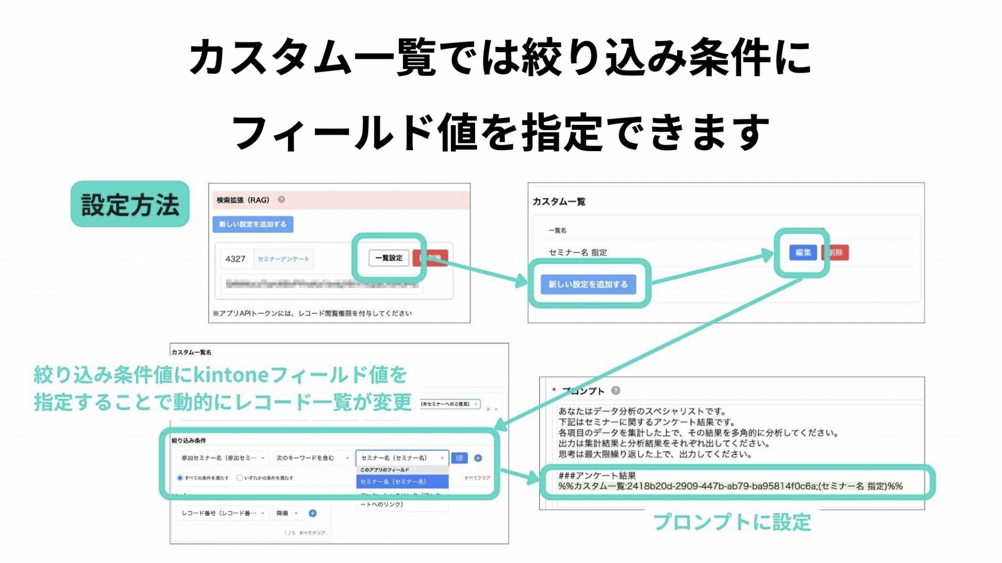 「RAGカスタム」一覧機能では、レコード一覧の条件にフィールドの値を設定でき、生成実行するレコードの値から動的に取得先アプリのレコードを取得することができます。