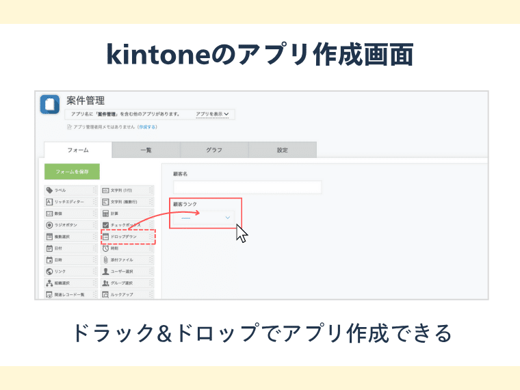 kintoneの代表的なノーコード機能のひとつがアプリ作成機能です。フォームの作成や項目の配置など、すべての操作を画面上で完結させることができます。新しいアプリは「+」ボタンから簡単に作成でき、文字列、ドロップダウン、日付、添付ファイルなどの入力フィールドをドラッグ&ドロップで自由に配置することが可能です。さらに一覧画面やグラフの表示形式も視覚的に設定できるため、より簡易的にデータの管理や分析ができ、業務ごとの使い勝手に合わせたアプリ設計ができます。
