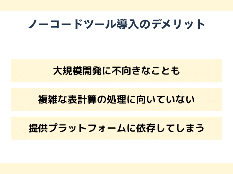 ノーコードツールは専門知識を持たない人でもアプリを開発できる利便性がある一方で、万能ではありません。あくまで「簡易的なアプリ開発」を目的とした仕組みのため、すべての業務要件を満たすには限界があります。