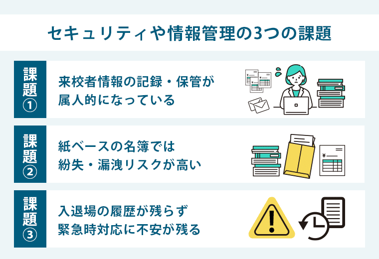 またアナログな受付対応は俗人的になりやすく受付情報が点在してしまうため、必要な情報をすぐに確認できないといった管理面での不便さも問題です。特に個人情報を扱う学校では、管理が煩雑になるほどリスクも高まります。