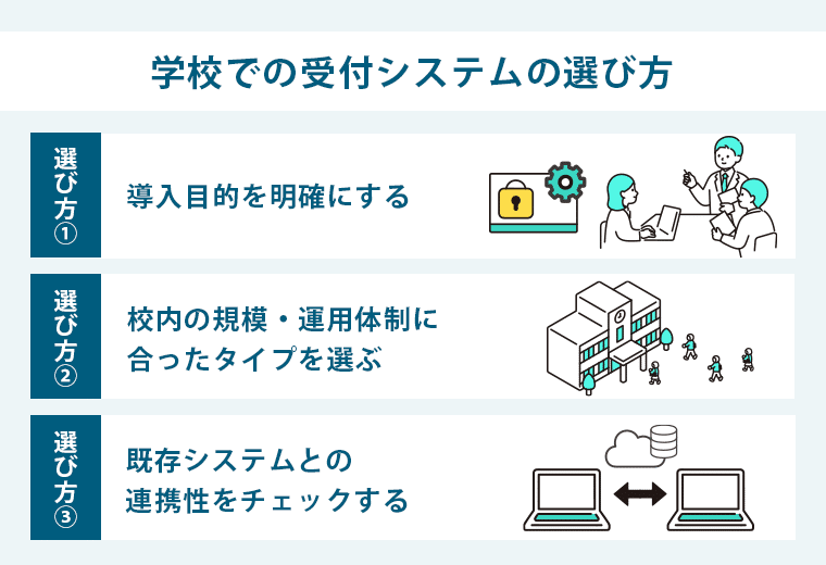 受付システムを導入することで得られる効果について理解を深めた上で次に考えるべきは、自校にとってどのようなシステムが最適かを見極めることです。