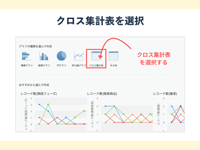 グラフタイプとして「クロス集計表」を選びます。これは「項目A × 項目B」のような二軸での集計を可能にする形式です。