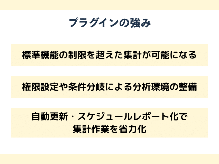 さらにプラグインを組み合わせれば「スケジュール実行」「PDF化」「外部共有」などにも対応でき、業務の属人化を防ぎながら再現性のあるレポーティング体制を構築できます。これにより現場は分析や意思決定など、より本質的な業務に時間を使えるようになります。