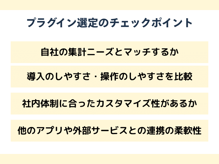 プラグイン導入時は単に「できること」だけでなく、「自社に合っているかどうか」を見極めることが重要です。機能の豊富さに目が向きがちですが、実際に使うのは現場の担当者で、操作性やメンテナンス性、自社システムとの親和性まで含めて検討する必要があります。ここではプラグイン選定時に使える4つのチェックポイントについて解説します。