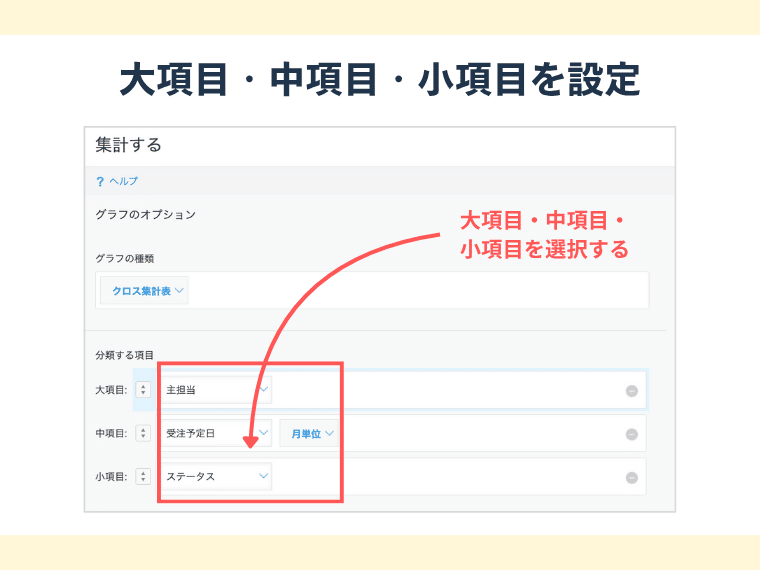 縦軸・横軸に表示するフィールド(例:担当者、月、ステータスなど)をそれぞれ設定し、データの分類軸を決定します。