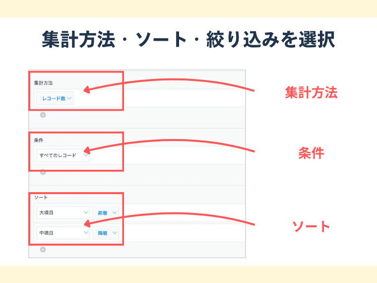 件数、合計、平均、最大値、最小値など、どのような方法で数値を算出するかを指定します。例えば「売上金額の合計」などです。