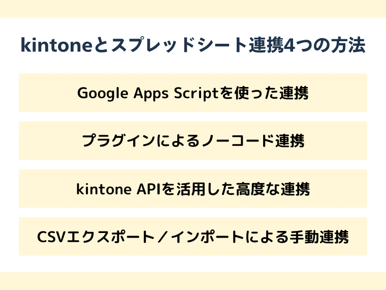 kintoneとスプレッドシートを連携させる方法には、主に「Google Apps Script(GAS)」「プラグイン」「API」「CSVファイルを使った手動連携」の4つが存在します。どの方法も特徴があるため、自社の業務内容やITリテラシー、予算に応じて最適な方法を選択することが重要です。