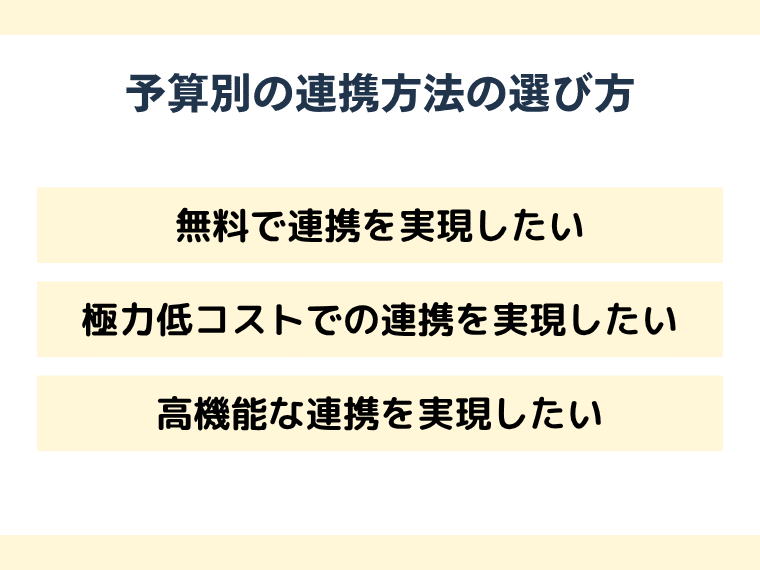 | 連携方法 | コスト | 自動化・リアルタイム性 | 導入難易度 | 向いているケース |