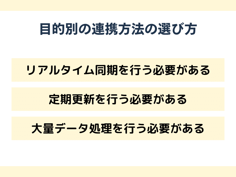 連携の手段を選ぶとき、多くの方がまず気にされるのは「何を目的として使いたいのか」という点です。リアルタイムでの同期を重視するのか、定期的な更新ができればよいのか、大量データを扱いたいのかによって選択肢は変わります。本章では目的ごとに適した方法を順番に確認していきます。
