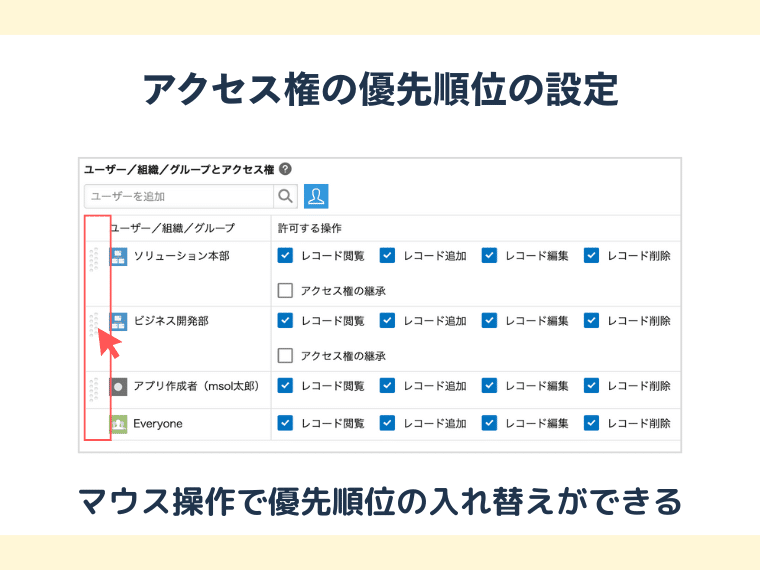 同じアプリやレコードに対して「ユーザー」「組織」「グループ」といった複数ユーザ単位を対象に異なるアクセス権が設定されている場合は、設定画面上での並び順がそのまま優先順位として適用されます。