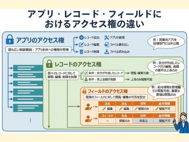 kintoneのアクセス権設定には、「アプリ」「レコード」「フィールド」の3つの階層があり、それぞれに異なる役割と制御範囲があります。