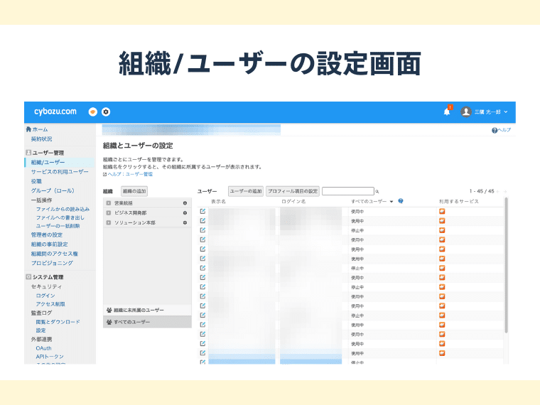 まずcybozu.com共通管理の管理者ユーザーとしてログインし、管理画面メニューの「組織/ユーザー」へアクセスします。この画面ではすでに登録されている組織構造の確認や新たな部署の追加・編集が可能です。アクセス権を設計するうえで、まずは対象となる組織の正確な構成を把握しておく必要があります。