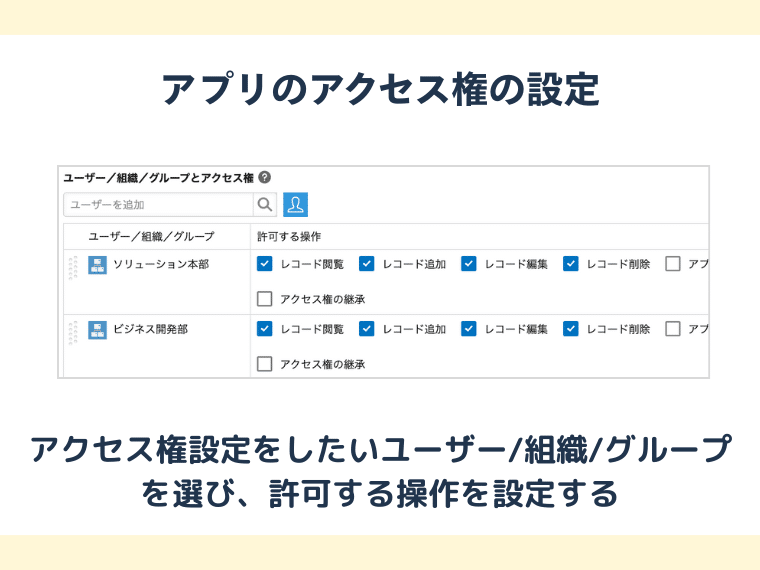 グループの作成が完了したら対象となるアプリの任意の「アクセス権設定」画面を開き、対象者を先ほど作成したグループ名を選択します。これによりそのグループに所属する全メンバーに対して一括でアクセス権を付与することが可能になります。