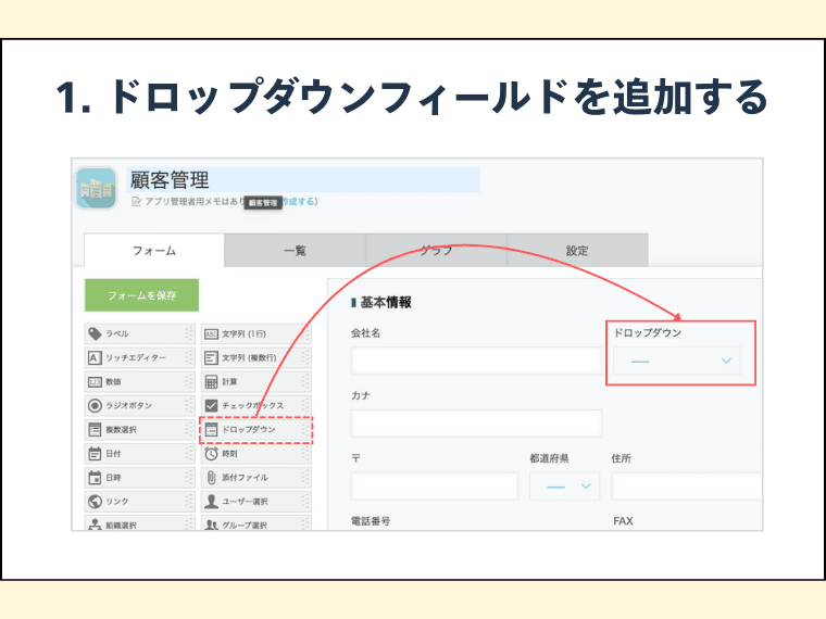 フィールドを追加するにはまず対象のアプリを開き、右上の「アプリの設定」から「フォーム」を選択します。フォーム編集画面が表示されたら左側のフィールド一覧から「ドロップダウン」を選び、ドラッグ&ドロップでフォーム内の任意の位置に配置します。