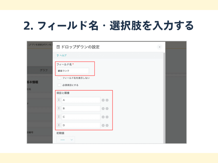 フィールドを追加した後はフィールド名と選択肢を設定します。フィールド名にはユーザーが見てすぐに内容を理解できるような明確な名称を入力しましょう。例えば「部署」「対応ステータス」「カテゴリ」など、業務に即した名称が望ましいです。次に選択肢のリストを1行ずつ入力します。選択肢の並び順も利用頻度や業務フローに合わせて整理しておくと、ユーザーが選びやすくなります。