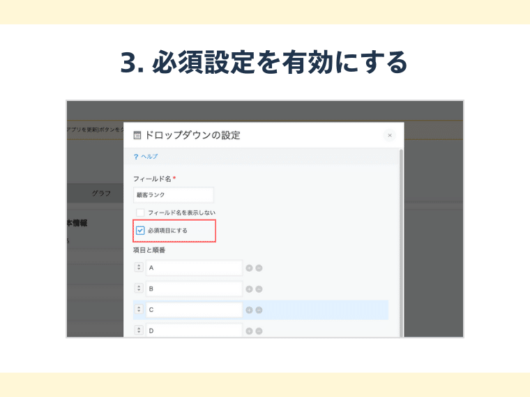 入力漏れを防ぐために必要に応じて「必須項目」の設定を行います。フィールドの設定画面で「必須にする」のチェックボックスを有効にすると、レコード登録時にこのフィールドを空欄のままにできなくなります。