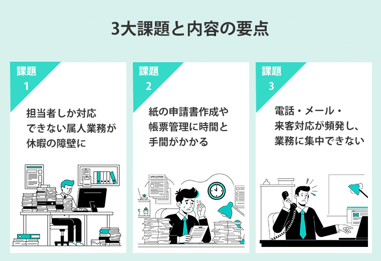 総務業務の中には、長年放置されてきた非効率な慣習や構造的な課題が数多く残されています。特に改善の優先度が高いとされるのが属人化された業務や紙による申請や管理の煩雑さ、そして突発対応による業務の断絶という3つの課題です。