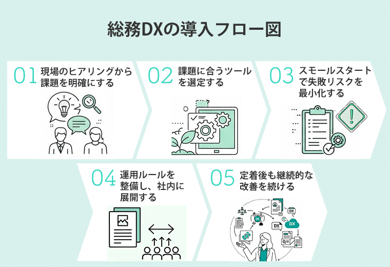 特にスモールスタートでの導入や現場を巻き込んだ運用ルールの整備、継続的な改善サイクルの構築は、総務DXを“実践で成功させるうえで欠かせない要素です。