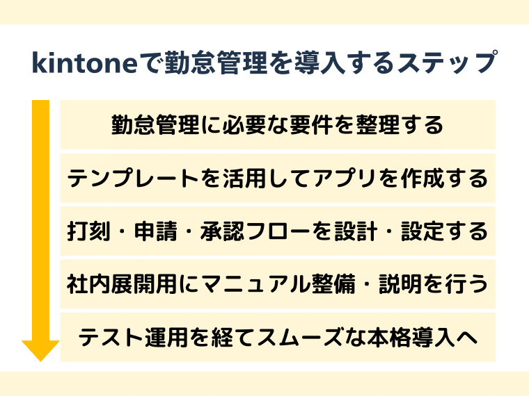 ここではkintoneで勤怠管理を構築・運用していくための5つのステップを順を追って解説します。