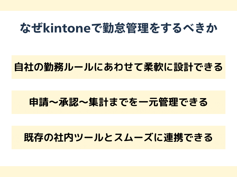 このセクションでは「従業員数」「職種の傾向」「勤務スタイル」という3つの視点から、自社に合ったkintoneの勤怠管理設計の考え方を具体的に解説していきます。