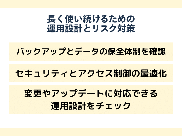 ここでは自社に最適な設計方針を見極めるための判断軸と、長期的な運用を見据えたリスク対策について解説します。