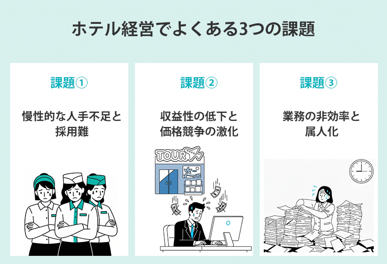 ホテル業界が直面している人手不足、収益性の低下、業務の属人化といった課題は今後さらに深刻化していくことが予想されます。こうした構造的な問題に対して従来の対症療法的な取り組みでは限界があり、業務全体の仕組みを根本から見直す必要があります。