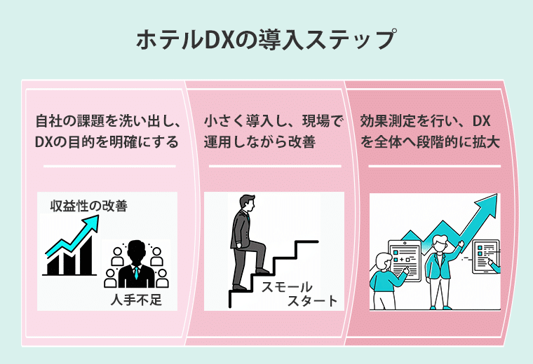 ここではホテルDXの導入をスムーズに進めるための3つの基本ステップについて具体的に解説します。