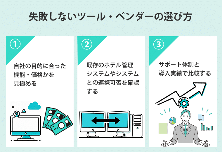ホテルDXの成否はどのツールをどのベンダーから導入するかによって大きく左右されます。いくら高機能なツールでも自社の業務に合っていなければ現場で使いこなせず、DXが形骸化する恐れがあります。