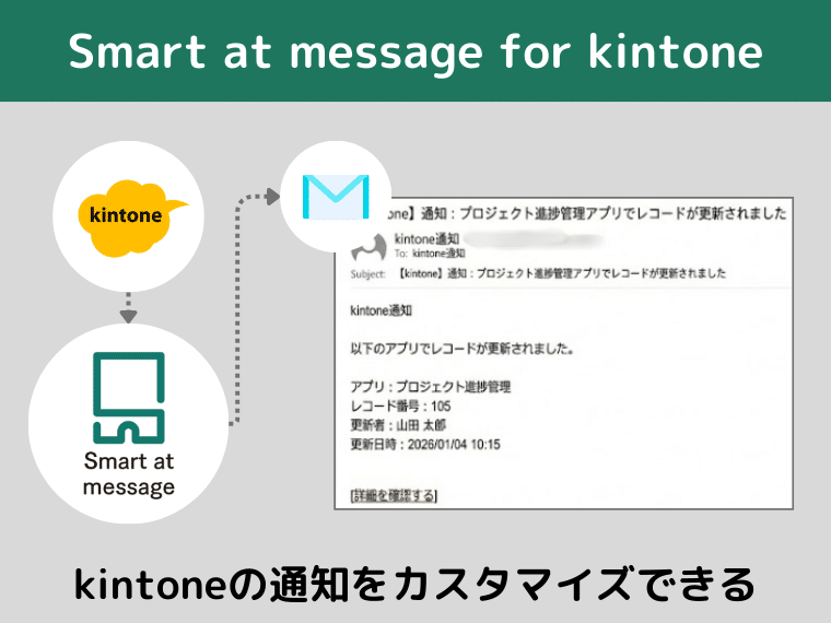 Smart at messageは、kintone の通知機能を強化するプラグイン/連携サービスです。標準の通知では難しい「件名や本文の自由カスタマイズ」「チャットツールへの通知」「kintoneアカウントを持たない人への通知」を実現できます。
