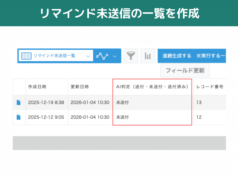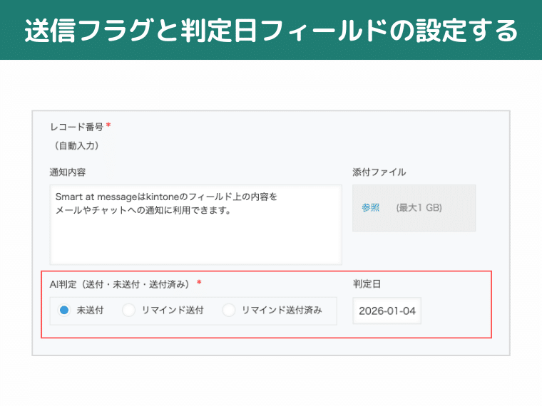 リマインド通知をしたいアプリに送信フラグを登録するドロップダウンフィールドと、リマインドを行うための判定日フィールドを設定します。これらのフィールドと後に設定するSmart at AIを用いて、リマインド通知をコントロールします。
