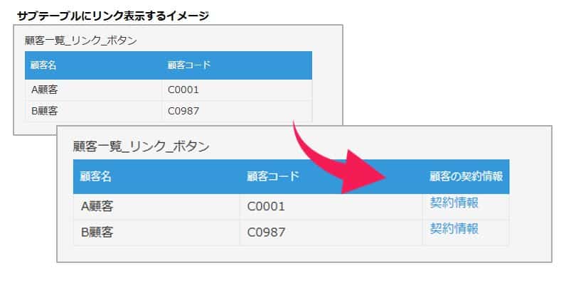 ボタン形式で表示したい場合は「ボタン表示inサブテーブル」が適しています。機能は同様ですが、視認性が高くクリック箇所が明確になります。
