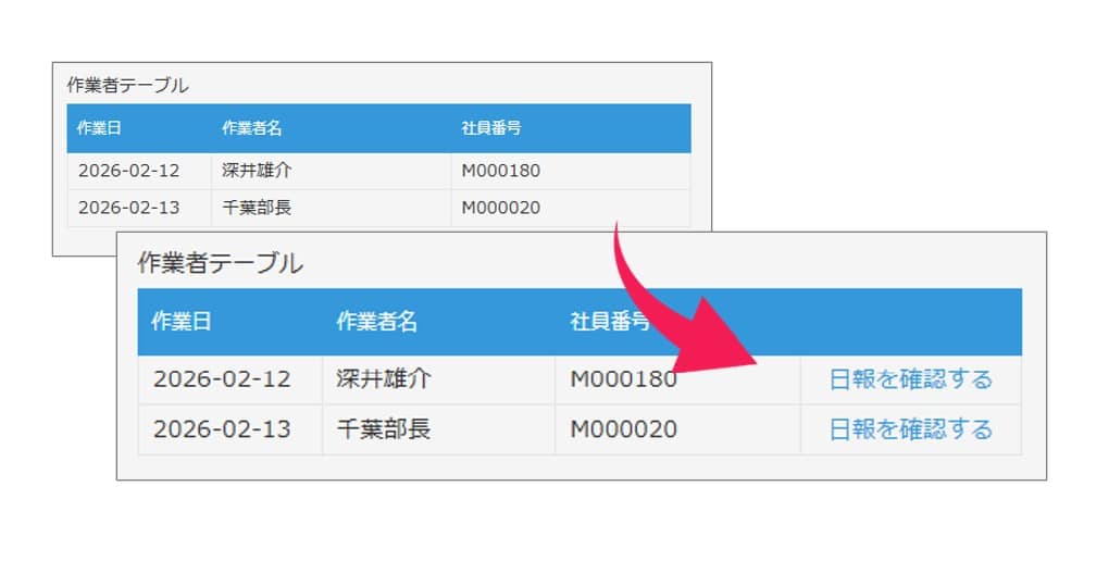 「ステータス別リンク表示inサブテーブル」と「ステータス別ボタン表示inサブテーブル」は、特定の条件のときだけリンクやボタンを表示する機能です。「作業完了」ステータスの時だけ作業者テーブルに外部システムへのリンクを表示するといった使い方ができます。業務フローに沿った情報アクセスを提供でき、不要な表示がなくなることで画面もすっきりします。
