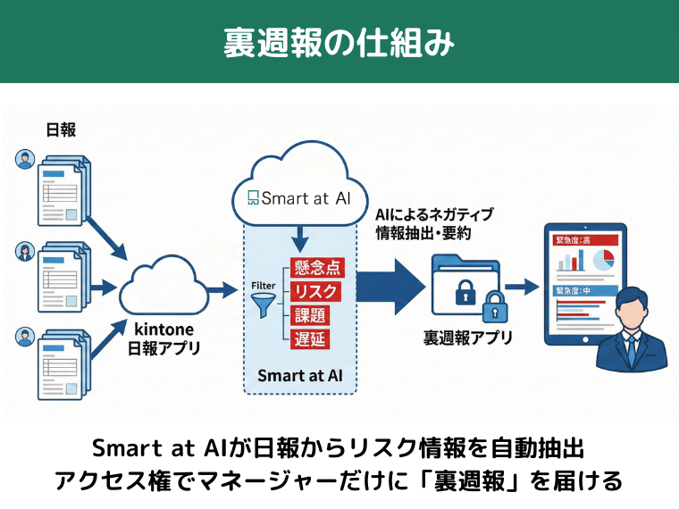 通常の週報とは別に、日報の中から懸念点・リスク・パフォーマンスの問題など、ネガティブな情報だけを抽出・要約したレポートです。kintoneのアクセス権機能を生かして、マネージャーなど限られた人だけが閲覧できる運用が可能です。メンバー全員が見る通常の週報(=表)に対し、マネージャーだけが見るリスク情報のレポート(=裏)を作成することで、組織運営上のリスクを確実にキャッチする。この二層構造が裏週報のポイントです。