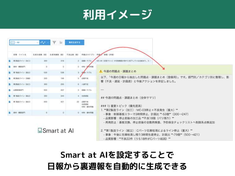 日報は書いて終わりではなく、そこから価値を引き出してこそ意味があります。kintoneとSmart at AIを組み合わせた裏週報は、日報データから経営判断に必要な情報を自動的に抽出し、マネージャーに届ける仕組みです。