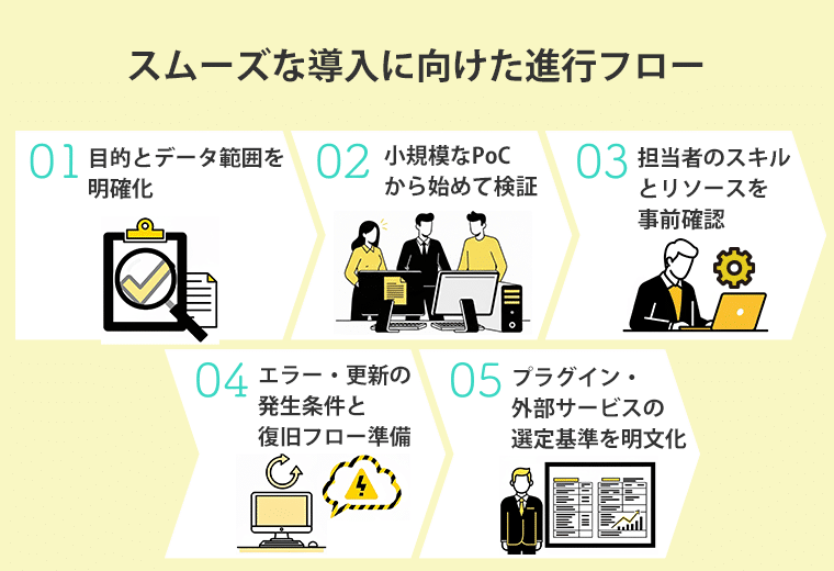 その後、フィードバックをもとに改善を重ね、全社展開へと段階的に拡大していくのが理想です。導入の過程では担当者のスキルやリソース、連携のトリガー条件、更新エラー時の復旧フローなども事前に整理しておくと、想定外のトラブルを回避しやすくなります。