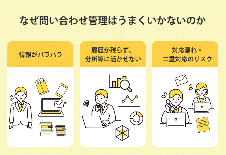 前述のように、問い合わせ対応の現場では「情報の分断」「履歴の不在」「対応の属人化」といった課題が多くの企業で発生しています。これらの課題を放置すれば、対応品質の低下や顧客との信頼関係の悪化に直結しかねません。